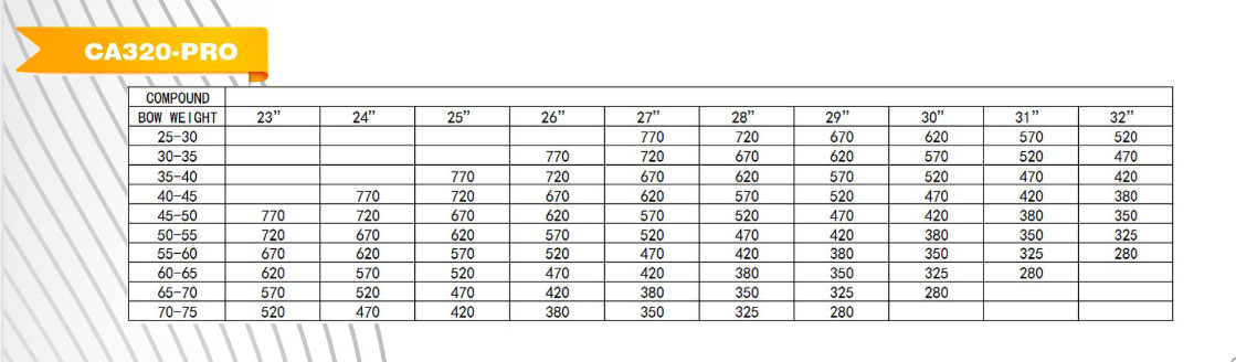 La CA320 est une version haut de gamme dédiée aux arcs à poulies. Elle est conçue pour le tir extérieur (à toutes les distances). Ses caractéristiques reprennent celles de la CA320 avec une spécificité propre aux arc à poulies (qui ne subissent pas ou très peu de paradoxe). Sa forme est elle aussi conique mais ses extrémités sont parallèles apportant vitesse, stabilité et réduction tout en réduisant la prise au vent. Sa qualité commence déjà à faire parler d’elle, les chinois(es) de l’équipe nationale en ont fait leur outil de records : 712 chez les hommes et 701 chez les femmes il y a quelques semaines de cela.